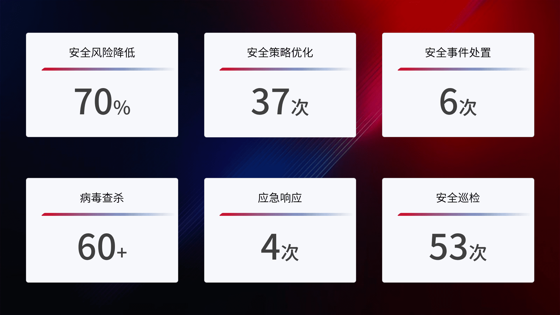 提供全面的安全事件报告体系,,,包括处置报告、、周报、、、季度和年度总结,,结合持续监控,,,帮助客户深入了解网络安全状况。。