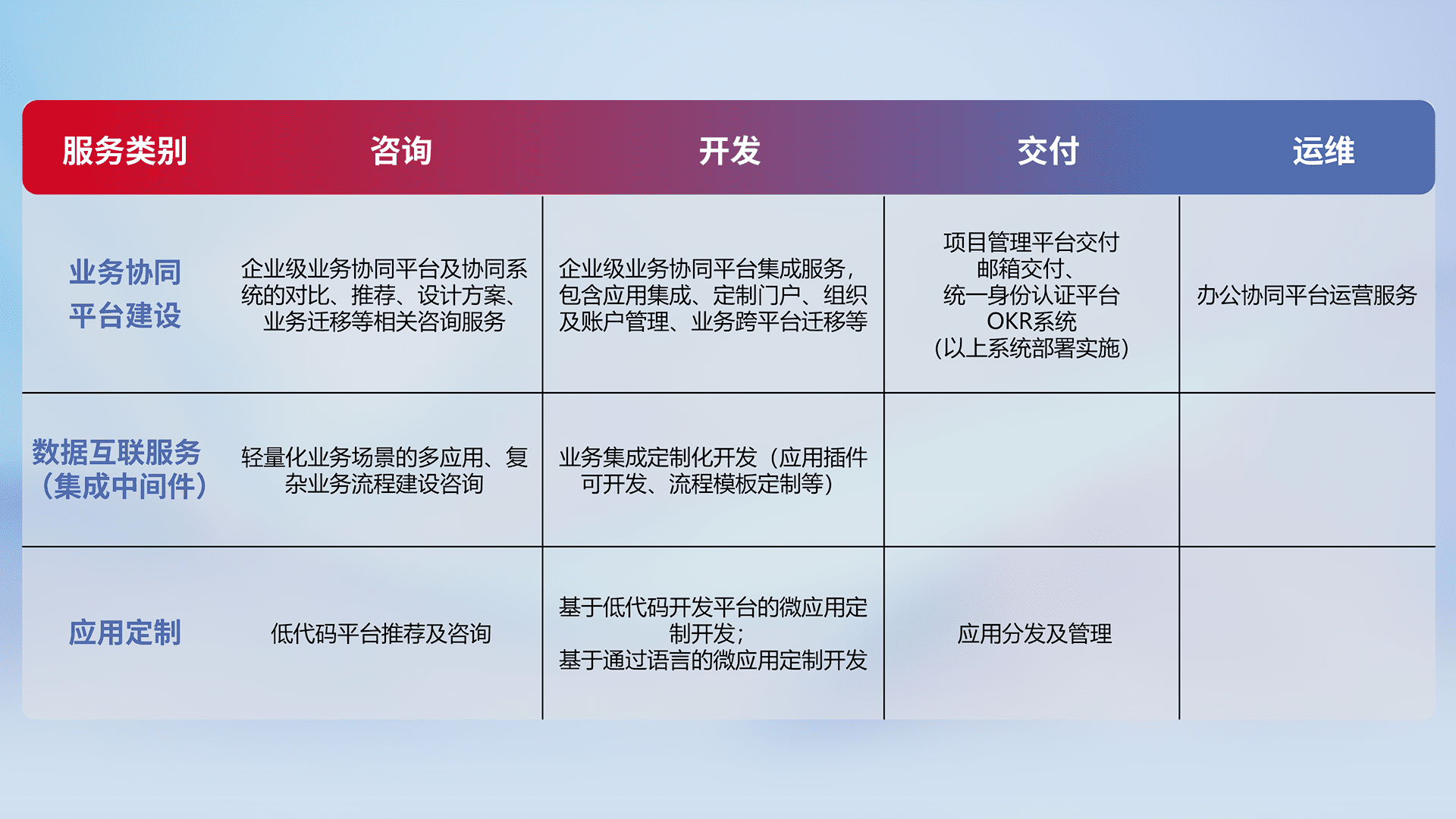 针对钉钉、、、、企微、、IDaas等平台级产品提供产品的规划、、、方案、、、、交付、、定制化开发等服务,,,,实现如统一协同办公、、、智能客户服务、、混合会议管理、、、、智能数据查询、、、等业务场景,,实现数字化转型。。